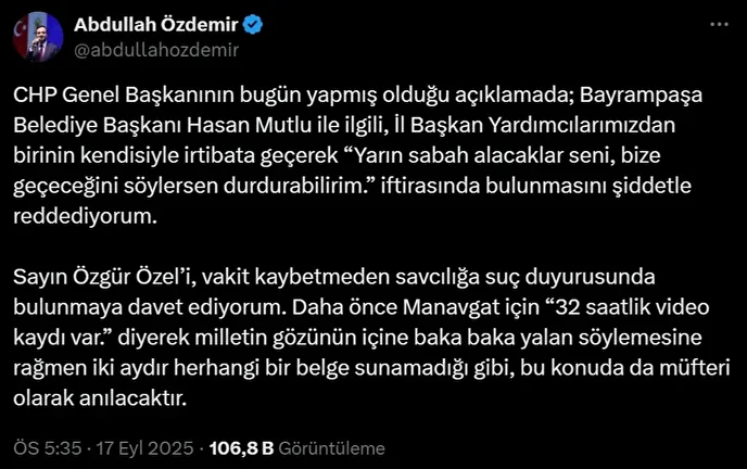“CHP Genel Başkanı’nın bugün yapmış olduğu açıklamada, Bayrampaşa Belediye Başkanı Hasan Mutlu ile ilgili, İl Başkan Yardımcılarımızdan birinin kendisiyle irtibata geçerek ‘Yarın sabah alacaklar seni, bize geçeceğini söylersen durdurabilirim’ iftirasında bulunmasını şiddetle reddediyorum. Sayın Özgür Özel’i vakit kaybetmeden savcılığa suç duyurusunda bulunmaya davet ediyorum.”