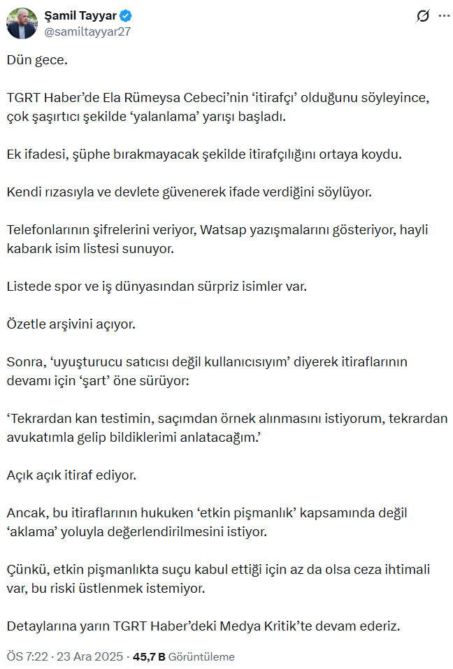 AKP’li eski vekil Şamil Tayyar, İstanbul Cumhuriyet Başsavcılığı tarafından yürütülen uyuşturucu operasyonu kapsamında tutuklanan spiker Ela Rumeysa Cebeci hakkındaki iddialarını sürdürüyor.
