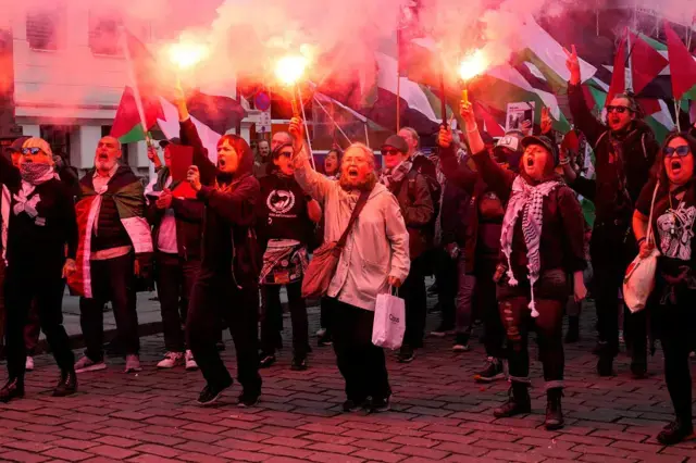 Spikersuppa Meydanı’ndan maçın oynanacağı Ullevaal Stadı’na hareket eden protestocular, “Filistin’e özgürlük”, “İsrail’i boykot et” sloganları atarken, Filistin bayrakları ve “İsrail’e kırmızı kart göster”, “Filistin’e özgürlük” “Soykırımcı İsrail” yazılı pankartlar taşıdı.