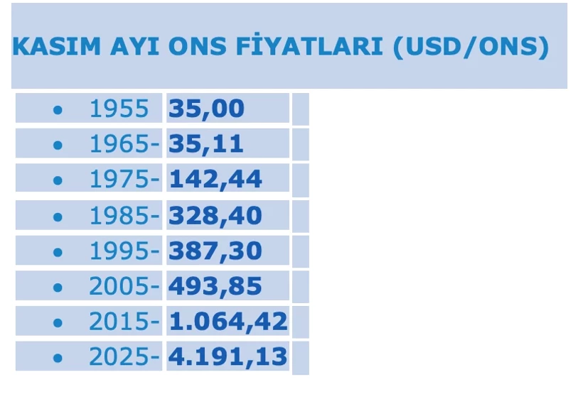 Altın fiyatlarına uzun dönemli bakmak gerekir. Onar yıllar içinde olarak bakarsak, bu onar yıllar içinde iniş-çıkışlar var ve fakat trend hep artış yönünde olmuştur. (Aşağıdaki tablo ve grafik)