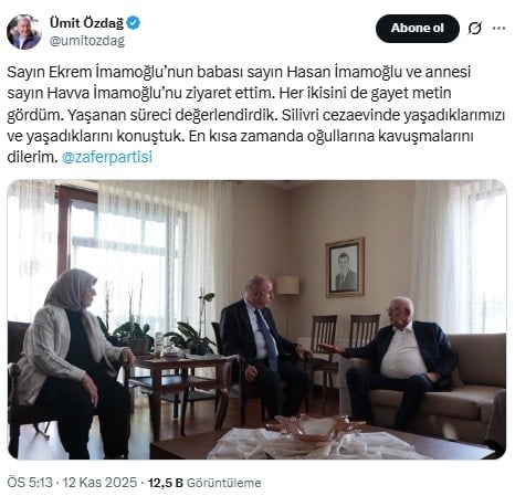 Zafer Partisi lideri Ümit Özdağ, Ekrem İmamoğlu’nun babası Hasan İmamoğlu ve annesi Havva İmamoğlu’nu ziyaret etti. Ziyaretini sosyal medya hesabından paylaştı.
